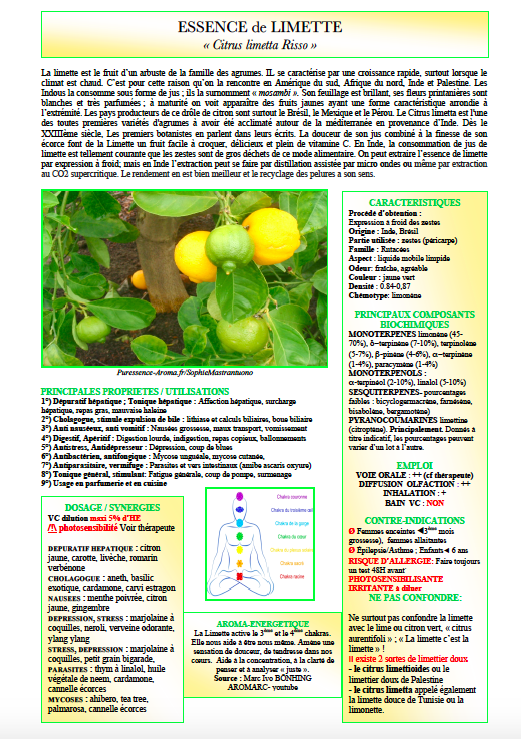 La limette est le fruit d’un arbuste de la famille des agrumes. IL se caractérise par une croissance rapide, surtout lorsque le climat est chaud. C’est pour cette raison qu’on la rencontre en Amérique du sud, Afrique du nord, Inde et Palestine. Les Indous la consomme sous forme de jus ; ils la surnomment « mosambi ». Son feuillage est brillant, ses fleurs printanières sont blanches et très parfumées ; à maturité on voit apparaître des fruits jaunes ayant une forme caractéristique arrondie à l’extrémité. Les pays producteurs de ce drôle de citron sont surtout le Brésil, le Mexique et le Pérou. Le Citrus limette est l’une des toutes premières variétés d’agrumes à avoir été acclimaté autour de la méditerranée en provenance d’Inde. Dès le XXIIIème siècle, Les premiers botanistes en parlent dans leurs écrits. La douceur de son jus combiné à la finesse de son écorce font de la Limette un fruit facile à croquer, délicieux et plein de vitamine C. En Inde, la consommation de jus de limette est tellement courante que les zestes sont de gros déchets de ce mode alimentaire. On peut extraire l’essence de limette par expression à froid; mais en Inde l’extraction peut se faire par distillation assistée par micro ondes ou même par extraction au CO2 supercritique. Le rendement en est bien meilleur et le recyclage des pelures a son sens.