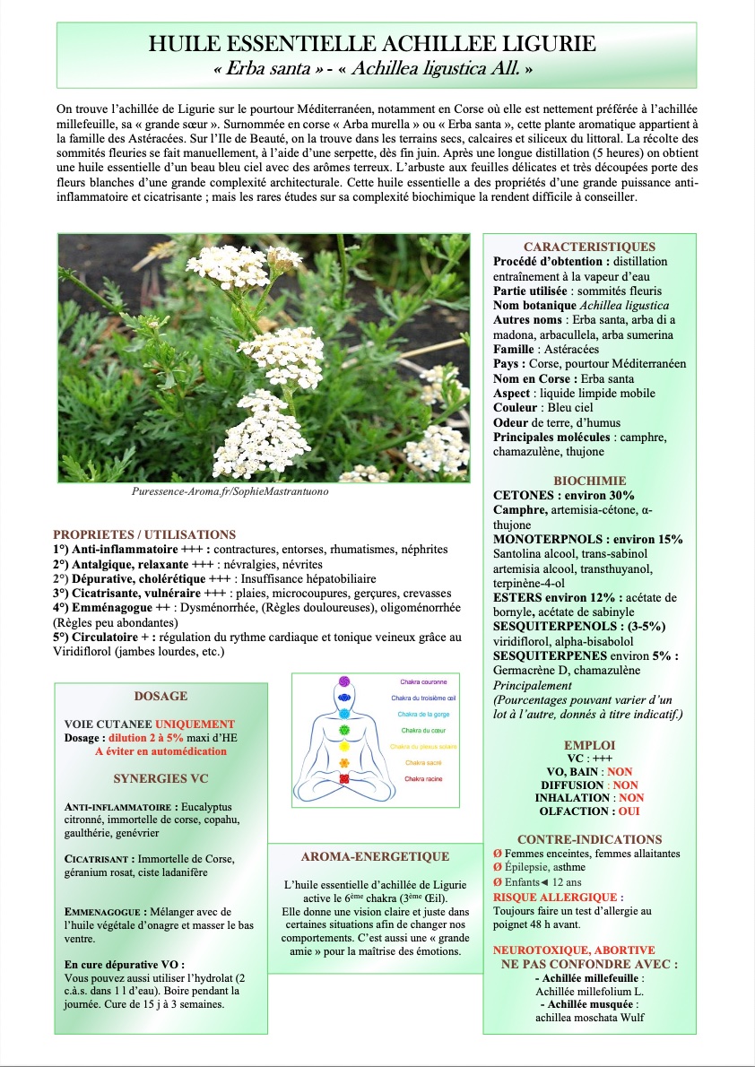 On trouve l’achillée de Ligurie sur le pourtour Méditerranéen, notamment en Corse où elle est nettement préférée à l’achillée millefeuille, sa «grande sœur». Surnommée en corse «Arba murella» ou «Erba santa», cette plante aromatique appartient à la famille des Astéracées. Sur l’Ile de Beauté, on la trouve dans les terrains secs, calcaires et siliceux du littoral. La récolte des sommités fleuries se fait manuellement, à l’aide d’une serpette, dès fin juin. Après une longue distillation (5 heures) on obtient une huile essentielle d’un beau bleu ciel avec des arômes terreux. L’arbuste aux feuilles délicates et très découpées porte des fleurs blanches d’une grande complexité architecturale. Cette huile essentielle a des propriétés d’une grande puissance anti-inflammatoire et cicatrisante; mais les rares études sur sa complexité biochimique la rendent difficile à conseiller.