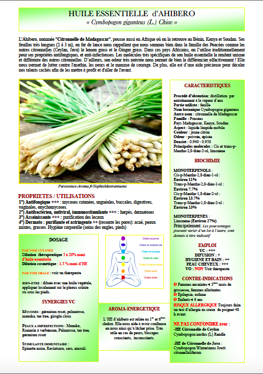 L’Ahibero, nommée “Citronnelle de Madagascar”, pousse aussi en Afrique où on la retrouve au Bénin, Kenya et Soudan. Ses feuilles très longues (2 à 3 m), en fer de lance nous rappellent que nous sommes bien dans la famille des Poacées comme les autres citronnelles (Ceylan, Java) le lemon grass et le Ginger grass. Dans ces pays Africains, on l’utilise traditionnellement pour ses propriétés antifongiques, et anti-infectieuses. Les molécules très spécifiques de son huile essentielle la rendent unique et différente des autres citronnelles. D’ailleurs, son odeur très poivrée nous permet de bien la différencier olfactivement! Elle nous permet de lutter contre l’apathie, les peurs et le manque de courage. De plus, elle est d’une aide précieuse pour déceler nos talents cachés afin de les mettre à profit et d’aller de l’avant.