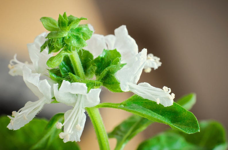 Plante sacrée des Indou, offerte à Krishna, Dieu sauveur du monde, le basilic sacré était, à l’origine cultivé en Inde ; il y a 4000 ans on ne l’utilisait pas dans l’alimentation, c’était une plante sacrée et protectrice . Ce n’est que vers 1938 que l’on commença à l’utiliser en tant qu’aromate. Plante vivace, annuelle, elle apprécie les climats chauds et les sols argileux et sablonneux. Ses tiges de forme quadrangulaire, peuvent atteindre soixante cm de hauteur. Ses feuilles sont duveteuses, brillantes et un peu crépues. Vers fin juillet, le basilic exotique porte des fleurs blanches très odorantes. Son huile essentielle est une antispasmodique musculotrope remarquable !