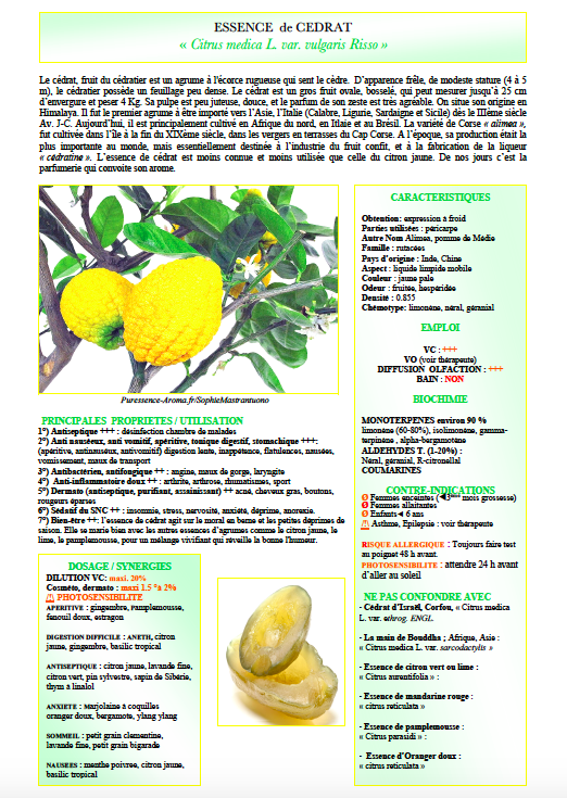 Le cédrat, fruit du cédratier est un agrume à l’écorce rugueuse qui sent le cèdre.  D’apparence frêle, de modeste stature (4 à 5 m), le cédratier possède un feuillage peu dense. Le cédrat est un gros fruit ovale, bosselé, qui peut mesurer jusqu’à 25 cm d’envergure et peser 4 Kg. Sa pulpe est peu juteuse, douce, et le parfum de son zeste est très agréable. On situe son origine en Himalaya. Il fut le premier agrume à être importé vers l’Asie, l’Italie (Calabre, Ligurie, Sardaigne et Sicile) dès le IIIème siècle Av. J-C. Aujourd’hui, il est principalement cultivé en Afrique du nord, en Itlaie et au Brésil. La variété de Corse « alimea »,fut cultivée dans l’île à la fin du XIXème siècle, dans les vergers en terrasses du Cap Corse. A l’époque, sa production était la plus importante au monde, mais essentiellement destinée à l’industrie du fruit confit, et à la fabrication de la liqueur « cédratine ».L’essence de cédrat est moins connue et moins utilisée que celle du citron jaune. De nos jours c’est la parfumerie qui convoite son arome.