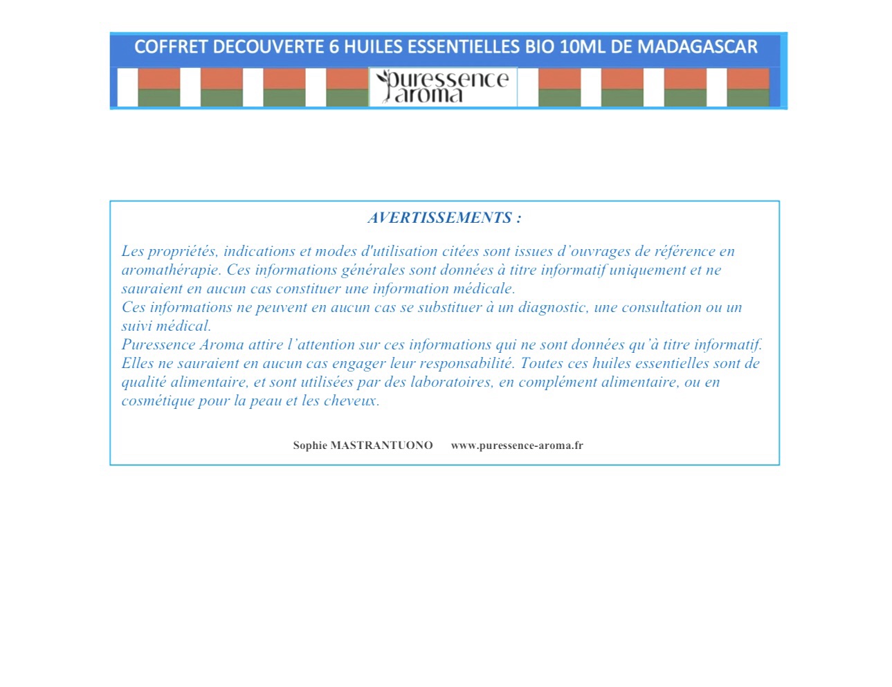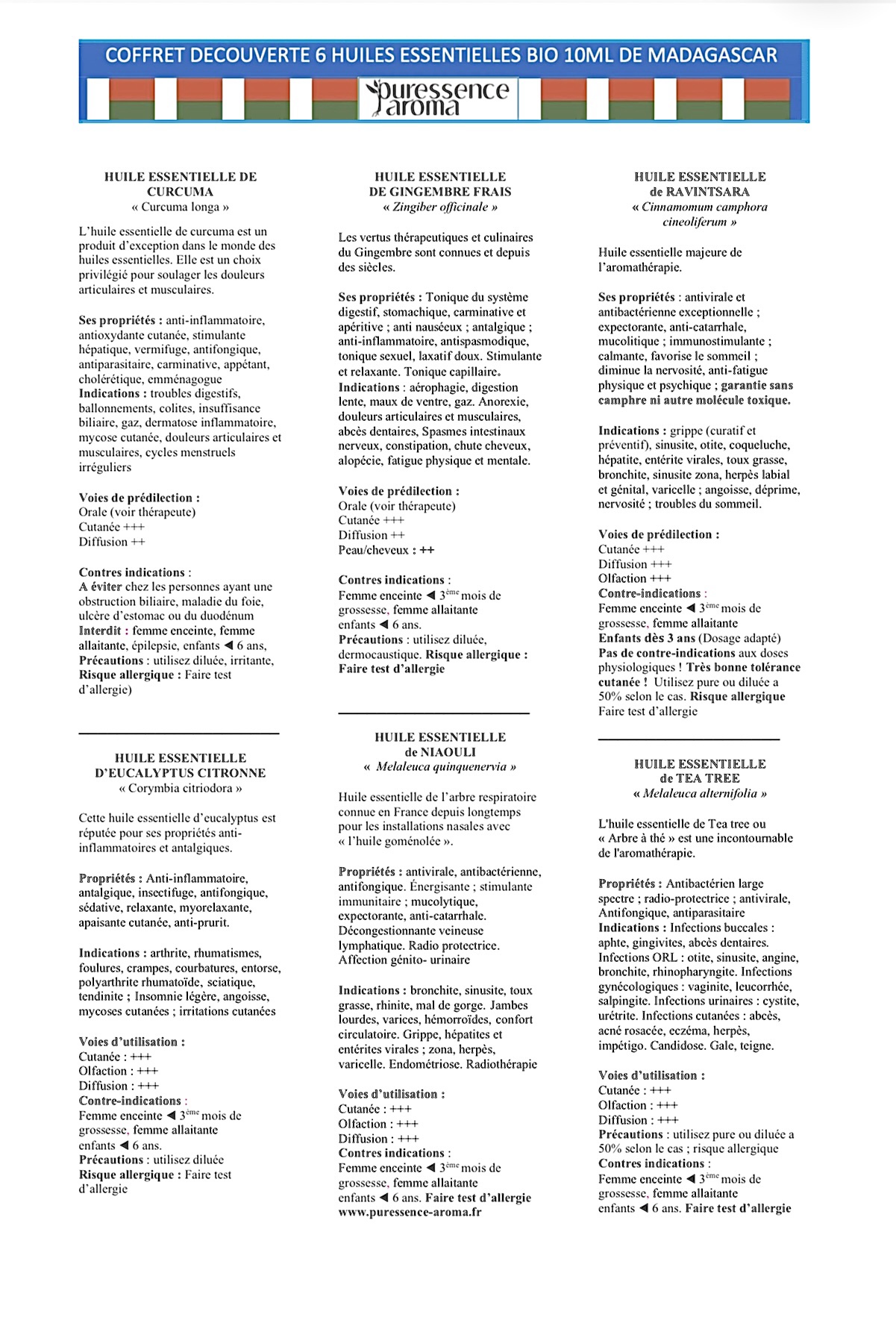 Il est présenté dans une boîte en papier kraft écologique et recyclable; il réunit 6 huiles essentielles bio en 10 ml aux propriétés remarquables, toutes distillées avec soin, utilisées autant en aromathérapie, cosmétique, diffusion qu’en soin corporel naturel.