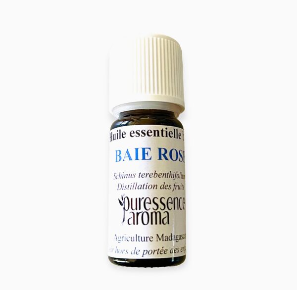 L’huile essentielle de Baie rose est une huile essentielle artisanale et authentique obtenue par distillation à la vapeur des graines de Schinus terebinthifolia Raddi, arbuste de la famille des Anacardiacées à feuilles persistantes. Les feuilles très aromatiques ainsi que les baies au goût sucré et légèrement poivré. Elles sont utilisées comme une épice sous le nom de baie rose, poivre rose ou encore faux poivrier. L’arôme de la Baie rose, tout d’abord constitué de notes terpéniques, libère pour une fragrance riche, florale, sucrée qui se développera d’autant plus avec une huile végétale de Noisette par exemple.