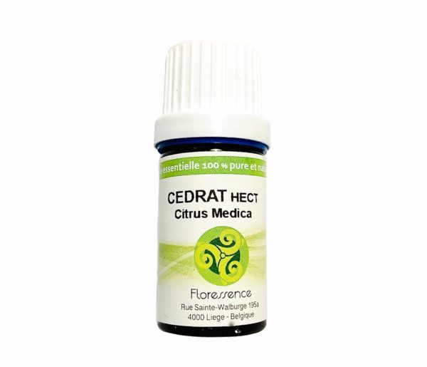L’huile essentielle de Cédrat provient du cédrat, fruit du cédratier est un agrume à l’écorce rugueuse qui sent le cèdre.  D’apparence frêle, de modeste stature (4 à 5 m), le cédratier possède un feuillage peu dense. Le cédrat est un gros fruit ovale, bosselé, qui peut mesurer jusqu’à 25 cm d’envergure et peser 4kg. Sa pulpe est peu juteuse, douce, et le parfum de son zeste est très agréable. On situe son origine en Himalaya. Il fut le premier agrume à être importé vers l’Asie, l’Italie (Calabre, Ligurie, Sardaigne et Sicile) dès le IIIème siècle Av. J-C. Aujourd’hui, il est principalement cultivé en Afrique du nord, en Italie et au Brésil. La variété de Corse « alimea »,fut cultivée dans l’île à la fin du XIXème siècle, dans les vergers en terrasses du Cap Corse. A l’époque, sa production était la plus importante au monde, mais essentiellement destinée à l’industrie du fruit confit, et à la fabrication de la liqueur « cédratine ». L’essence de cédrat est moins connue et moins utilisée que celle du citron jaune. De nos jours c’est la parfumerie qui convoite son arôme.