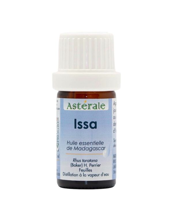 Arbuste pouvant atteindre 1 à 2 mètres de hauteur. Plante herbacée vivace, à tiges dressées et ramifiées; feuilles alternes simples, ovales, de couleur vert foncé et de texture légèrement veloutée. Ses fleurs sont blanches petites et réunies en grappes. Ses fruits sont des capsules rouges contenant des graines noires. On trouve le Issa abondamment sur la partie Est des hauts plateaux de la Grande Île de Madagascar. Les malgaches considèrent cette plante comme magique, énergétique et protectrice. La tige et les pousses de l’issa sont utilisées en infusion pour soigner les maladies gastriques et l’aérophagie. Les actions de l’Issa peuvent être comparées à celles du lentisque pistachier. Ces deux plantes appartiennent à la famille botanique des Anacardiacées et présentent des propriétés très similaires. Cependant, l’Issa se distingue par sa douceur et sa délicatesse, en en faisant un choix idéal pour un usage quotidien.