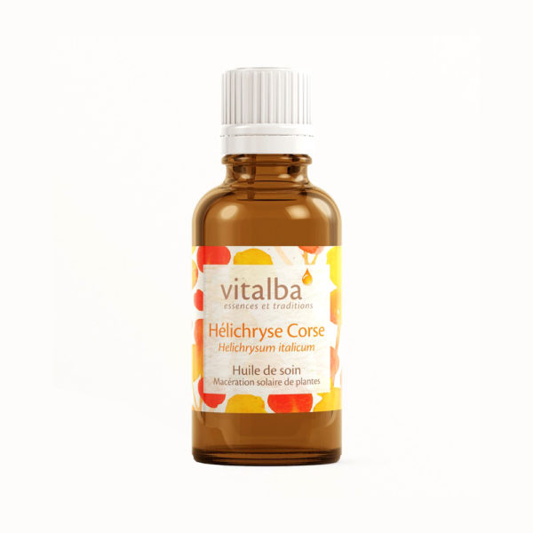 Le mâcérat d’hélichryse italienne est obtenu par macération solaire des fleurs fraiches d’hélichryse, cueillies en pleine floraison mi juin, puis mises au soleil du matin pendant 6 semaines dans de l’huile végétale de jojoba. L’Immortelle, cette plante solaire de Corse, dont la fleur ne fâne jamais, est un concentré d’actifs de longévité ! Elle permet d’atténuer les rides et ridules de notre visage ! Ce macérât stimule la production de collagéne pour lisser les rides du visage. Ce macérât est très efficace aussi pour résorber les contusions et les bleus.