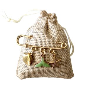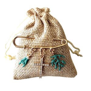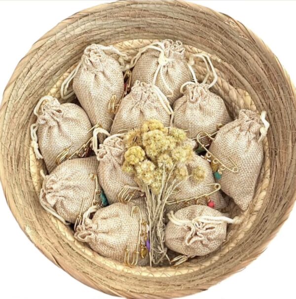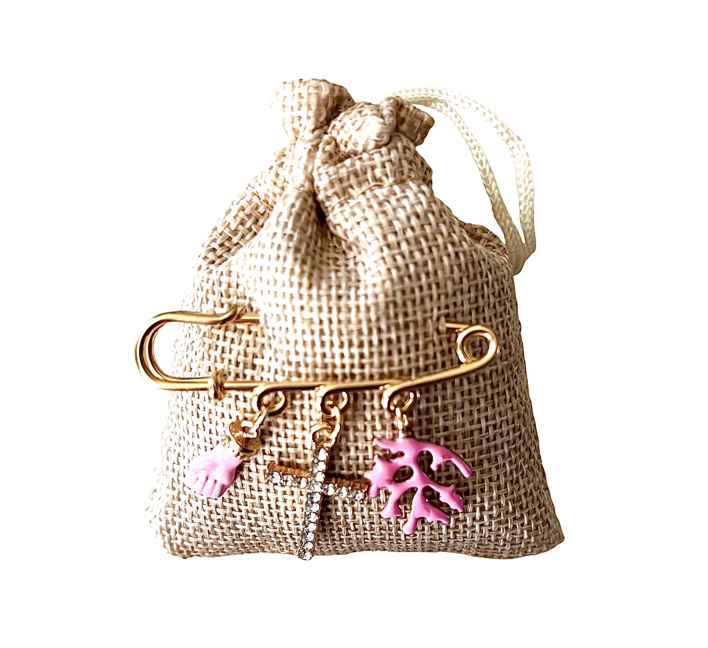 Sur chaque pochon en toile de jute une broche dorée épingle à nourrice 3 anneaux y est accrochée. Cette « broche » comporte des charms (Croix, main Corse, coquillages, médaille Vierge Marie, corail, cœur, coquillages, etc.) qui ajoutent une touche symbolique et décorative à l’ensemble.