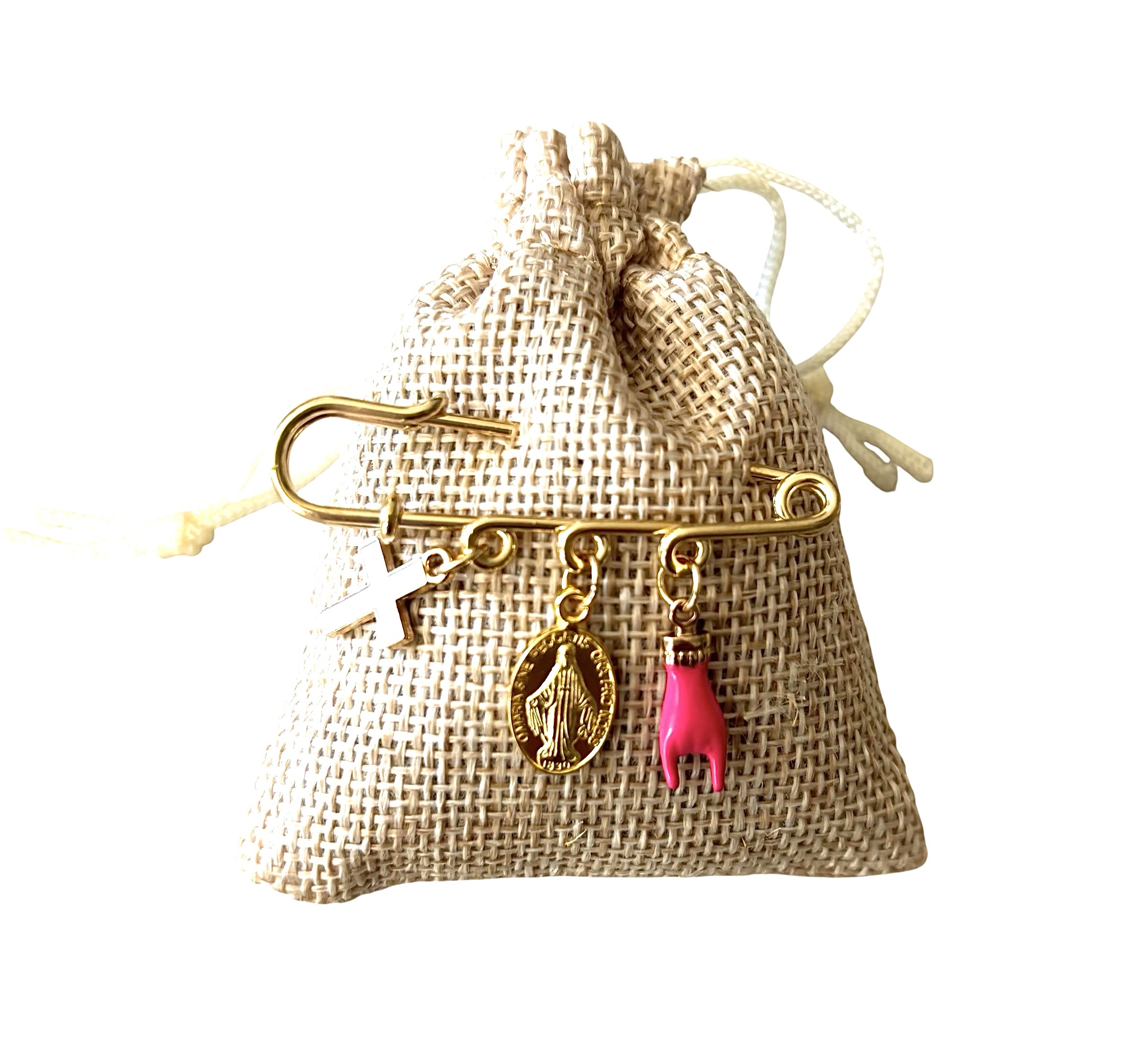 Sur chaque pochon en toile de jute une broche dorée épingle à nourrice 3 anneaux y est accrochée. Cette « broche » comporte des charms (Croix, main Corse, coquillages, médaille Vierge Marie, corail, cœur, coquillages, etc.) qui ajoutent une touche symbolique et décorative à l’ensemble.