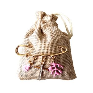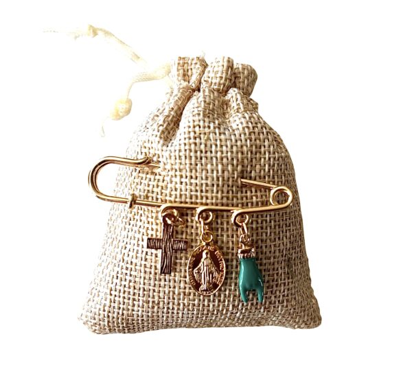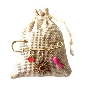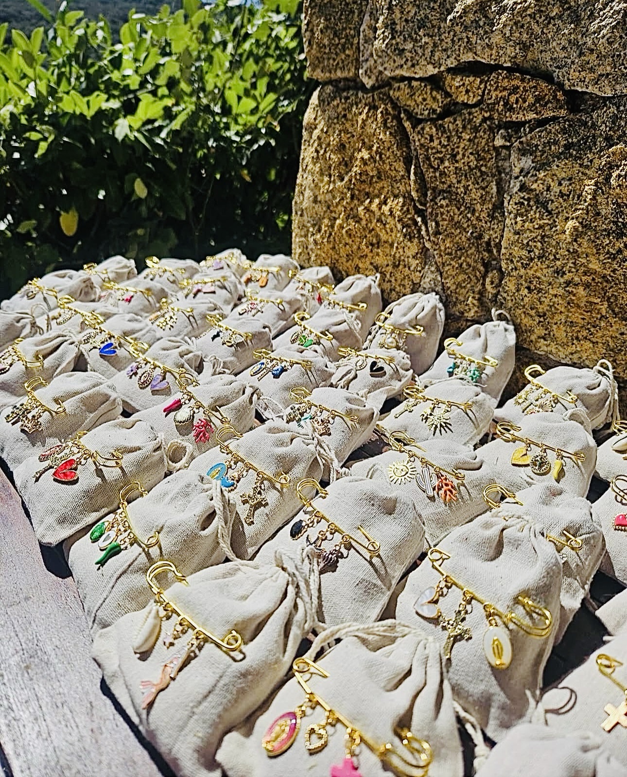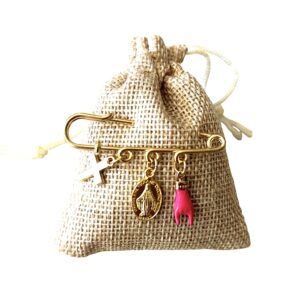 Sur chaque pochon en toile de jute une broche dorée épingle à nourrice 3 anneaux y est accrochée. Cette « broche » comporte des charms (Croix, main Corse, coquillages, médaille Vierge Marie, corail, cœur, coquillages, etc.) qui ajoutent une touche symbolique et décorative à l’ensemble.