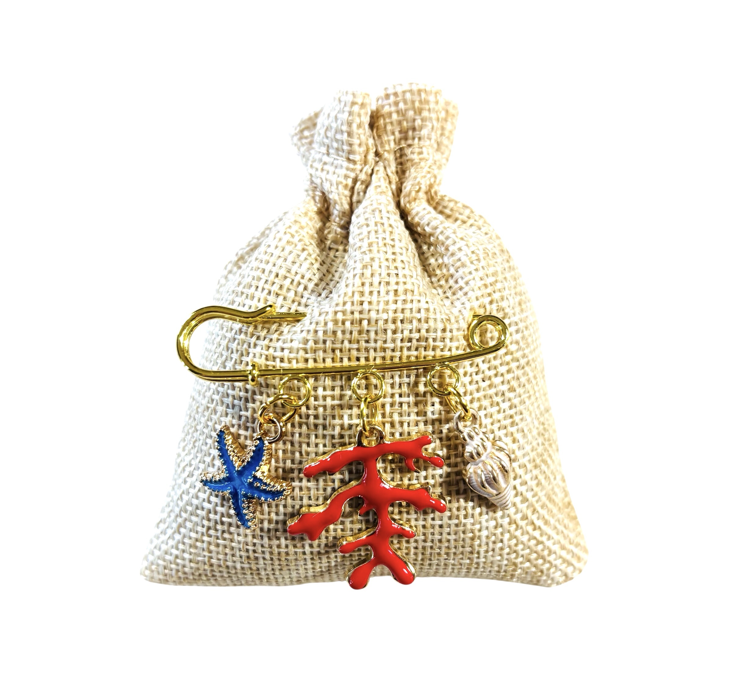Sur chaque pochon en toile de jute une broche dorée épingle à nourrice 3 anneaux y est accrochée. Cette « broche » comporte des charms (Croix, main Corse, coquillages, médaille Vierge Marie, corail, cœur, coquillages, etc.) qui ajoutent une touche symbolique et décorative à l’ensemble.