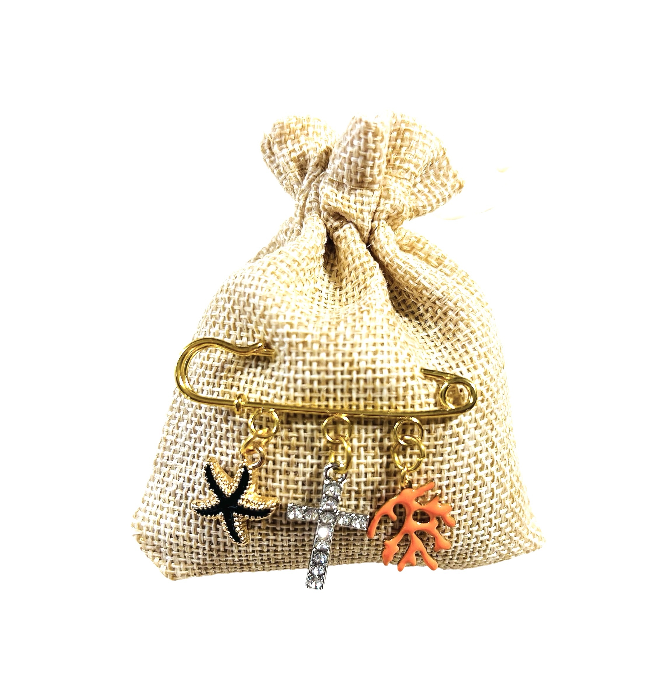 Sur chaque pochon en toile de jute une broche dorée épingle à nourrice 3 anneaux y est accrochée. Cette « broche » comporte des charms (Croix, main Corse, coquillages, médaille Vierge Marie, corail, cœur, coquillages, etc.) qui ajoutent une touche symbolique et décorative à l’ensemble.
