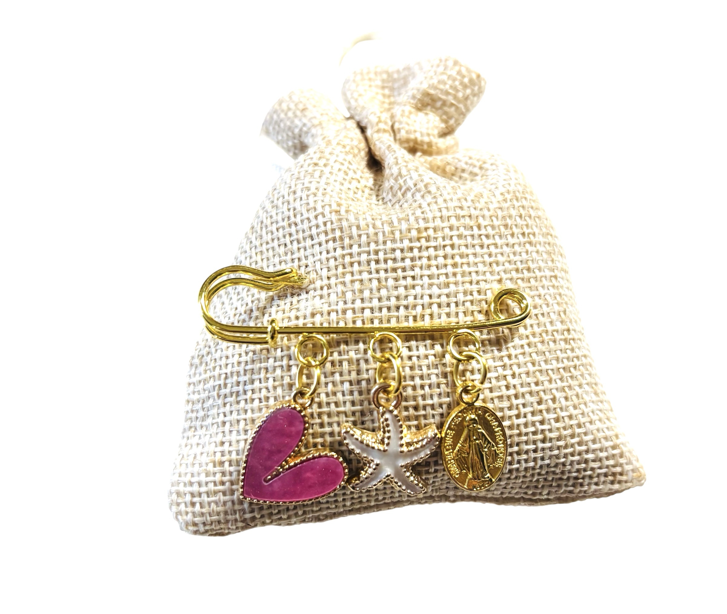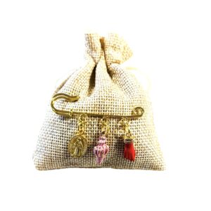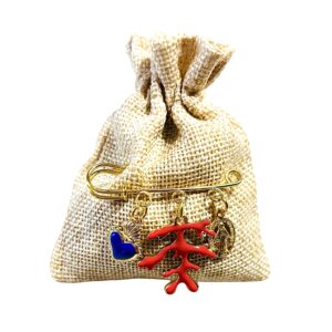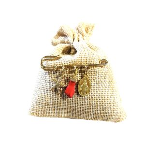 Sur chaque pochon en toile de jute une broche dorée épingle à nourrice 3 anneaux y est accrochée. Cette « broche » comporte des charms (Croix, main Corse, coquillages, médaille Vierge Marie, corail, cœur, coquillages, etc.) qui ajoutent une touche symbolique et décorative à l’ensemble.