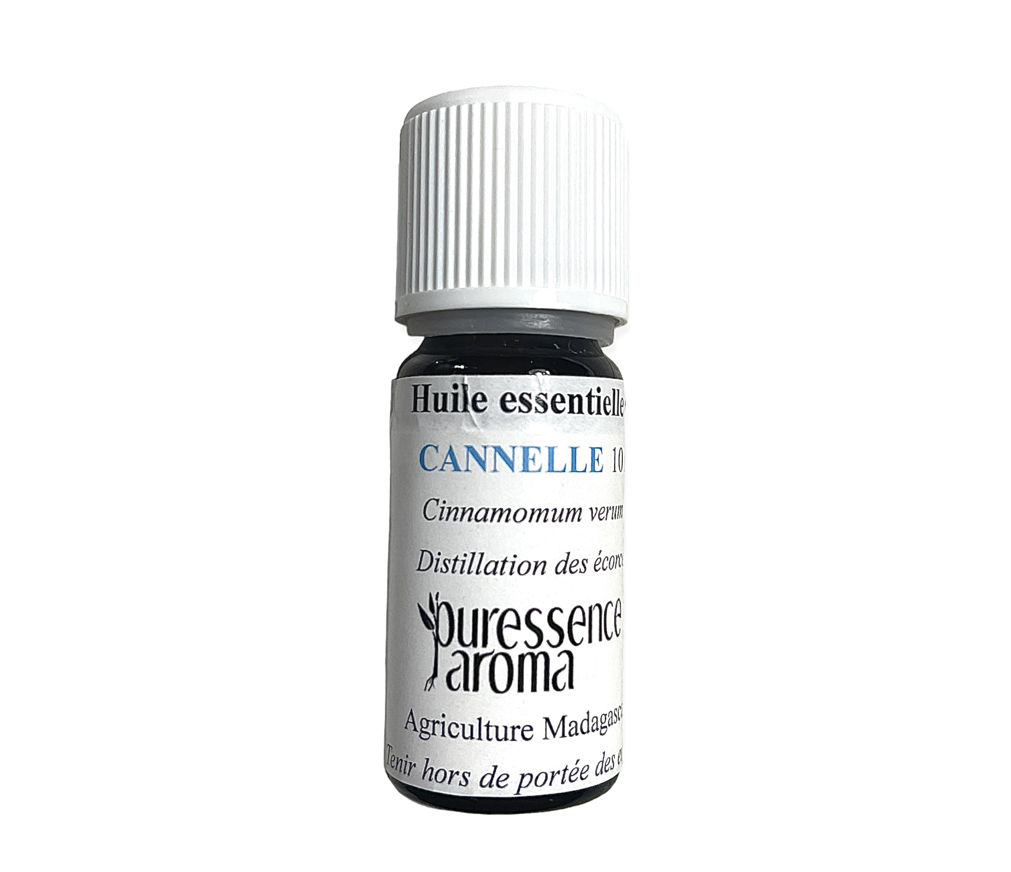 L’huile essentielle de Cannelle(écorce) est issue de la cannelle, épice familière, qui provient de l’écorce interne du cannelier de Ceylan. Le Cannelier est un arbre d’une dizaine de mètres de hauteur, au tronc droit et rougeâtre ; ses feuilles vertes sont persistantes, opposées et luisantes. Les branches « nouvelles » sont coupées et débarrassées de leurs écorces externes. La fine écorce intérieure est décollée, prélevée, puis grattée délicatement à la main avant de la faire sécher. Le célèbre « bâton de cannelle » se forme alors. L’utilisation de la cannelle remonte à l’Antiquité. Elle fut utilisée pour ses vertus médicinales, notamment aphrodisiaques. On l’employait en Egypte pour l’embaumement des morts. Dans la Bible, on la retrouve sous forme de « baume sacré. Elle fut aussi rapportée par les chevaliers lors des croisades, avec le poivre et autres épices rares. La cannelle est aussi utilisée en bâtonnet ou en poudre dans les plats Asiatiques et desserts Européens. Sesmultiples propriétés anti-infectieuse font d’elle une inconditionnelle de tout voyageur.